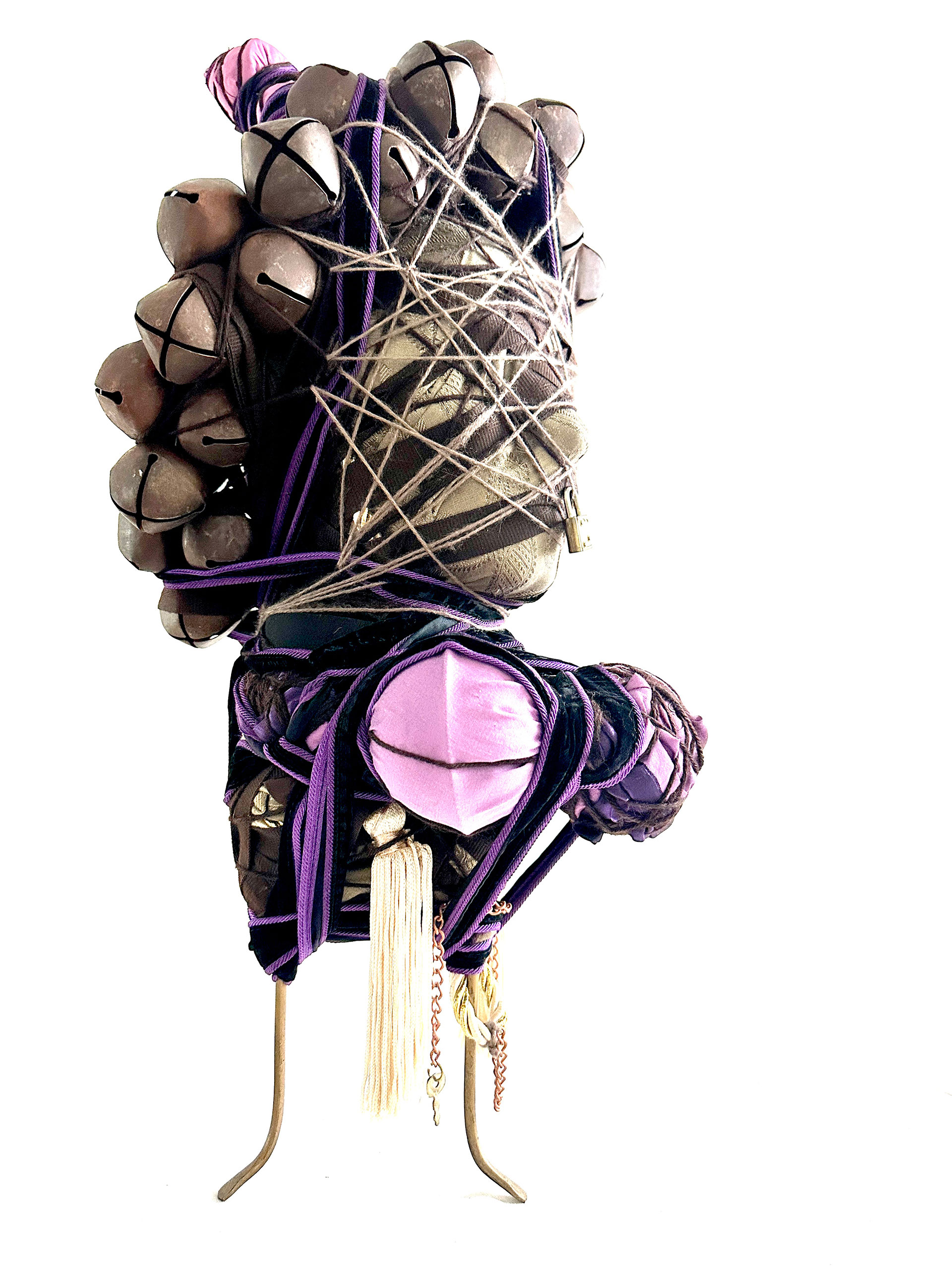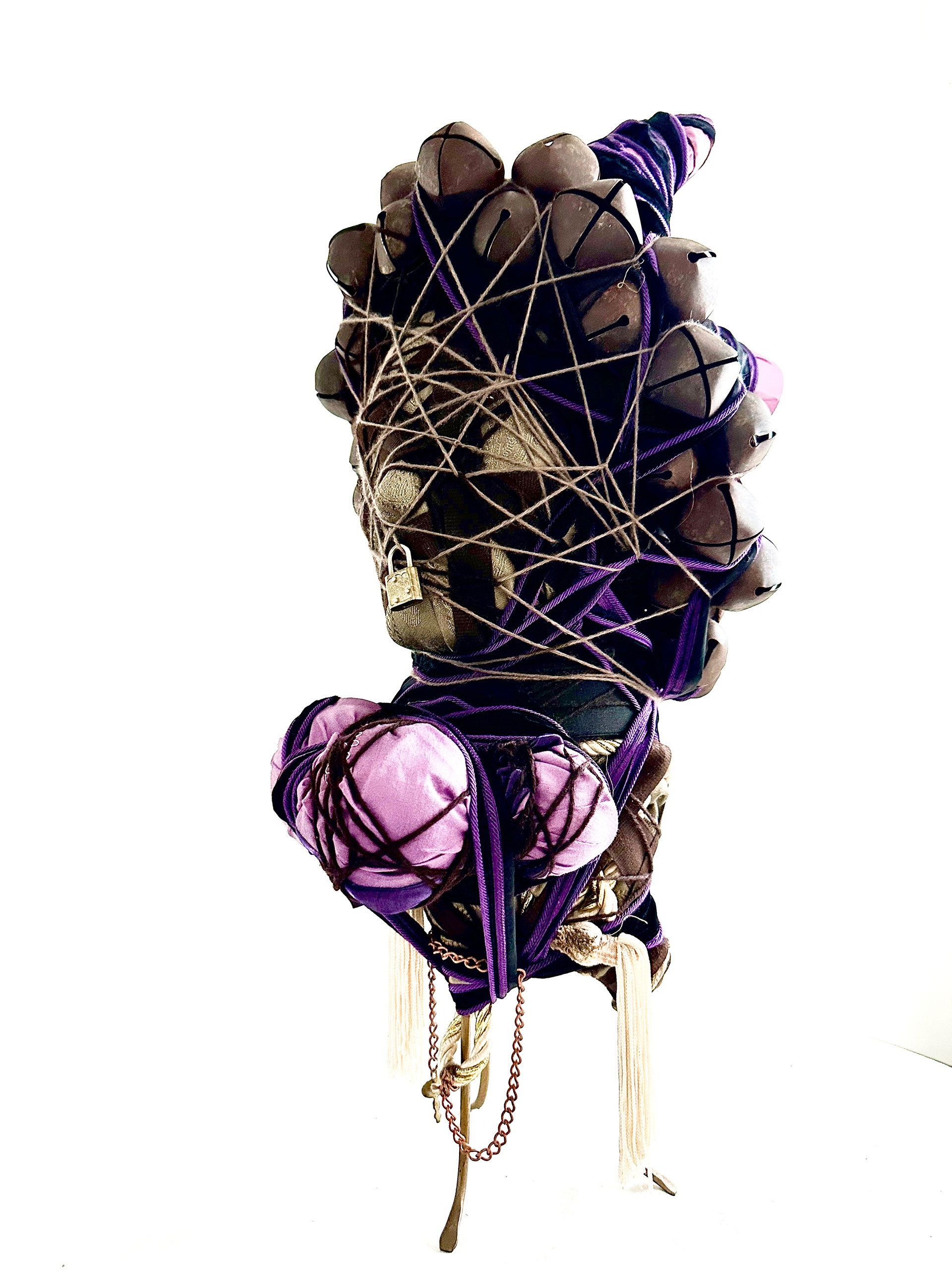 ‘Silenced’ explores the maternal resonance and democratic impact of absent voices. The sculpture, holding a key and lock, metaphorically binds matrilineal imprints while reflecting the stripping of women’s rights. It’s one of three ‘sisters’ built to share energy through individual tones of sound and silence.